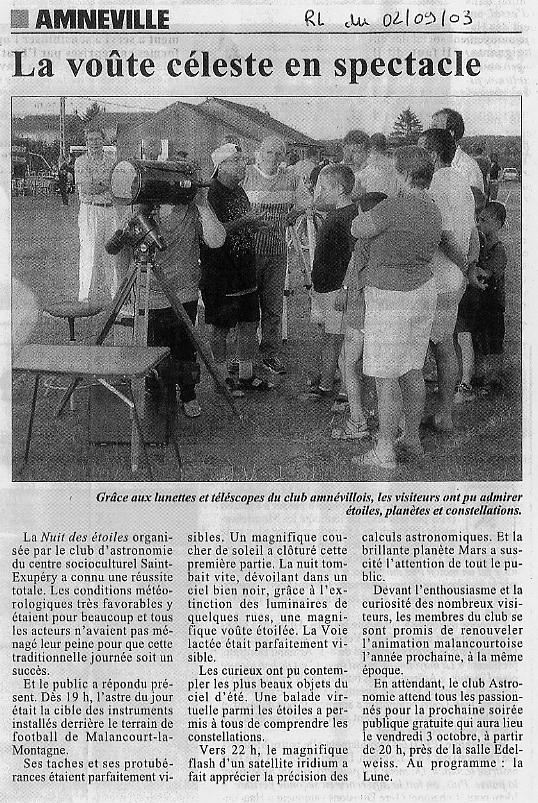 Suite à la nuit des étoiles du samedi 23 Août à Malancourt, toujours avec la participation de Malancourt-Culture-Loisir